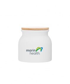 16.9 oz stoneware: matte white out / glossy white in with push-on bamboo lid; Hand wash recommended; Microwave safe with non-metallic imprint; 4 3/16 h x 4 3/16 (w/handle) w ; 500mL.