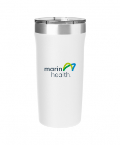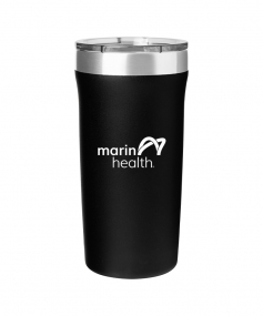 18 oz double wall 18/8 stainless steel thermal tumbler with vacuum insulation, brushed stainless steel rim, clear push-on acrylic lid with sliding closure, and powder coated finish. Hand wash recommended. Do not microwave. Complies with FDA, Prop 65. 7.25" H x 3.5" W