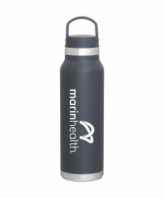 25 oz double wall 18/8 stainless steel thermal bottle with copper vacuum insulation, threaded insulated lid with carrying handle, high polish accent, stainless steel base, and powder coated finish. Hand wash recommended; Do not microwave. Dimensions: 10 H x 3".