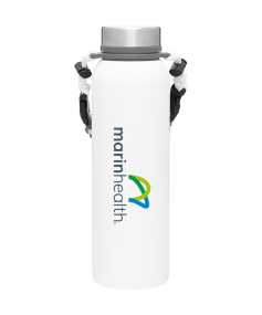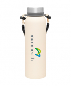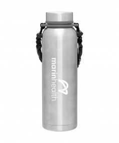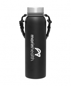 32 oz double wall 18/8 stainless steel thermal bottle with copper vacuum insulation, insulated stainless steel threaded lid, silicone ring, removable strap with buckles, removable clasps, and powder coated finish. Individual gift box. Hand wash recommended. Do not microwave. Complies with FDA, Prop 65. 11" H x 3.1875" W